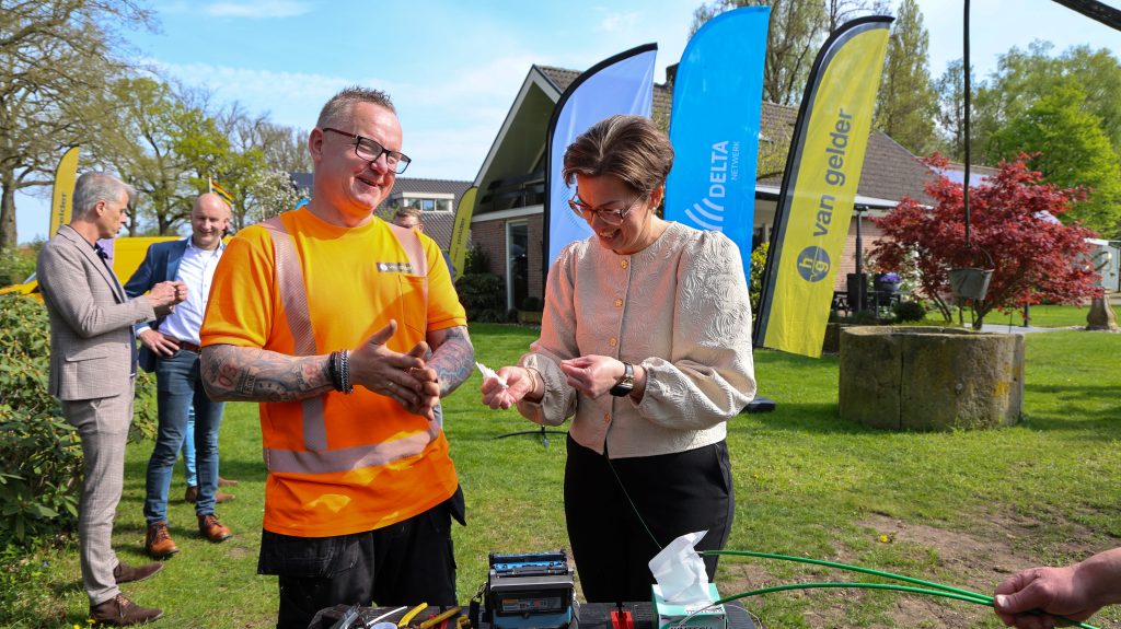 Op vrijdag 17 april hebben buurtbewoners, genodigden en samenwerkingspartners gezamenlijk de afsluiting van de glasvezelaanleg in de wijk ’t Gijmink in Goor gevierd. Dankzij een unieke samenwerking van inwoners, glasvezelbedrijf, netbeheerder, aannemer Van Gelder Telecom en gemeenten zijn in totaal ruim 600 glasvezelaansluitingen gerealiseerd in dit gebied en is ongeveer 13 kilometer aan tracé gegraven. Wethouder Miriam Doeschot van de gemeente Hof van Twente heeft ter afsluiting van het project samen met DELTA Netwerk de laatste aansluiting gelast.