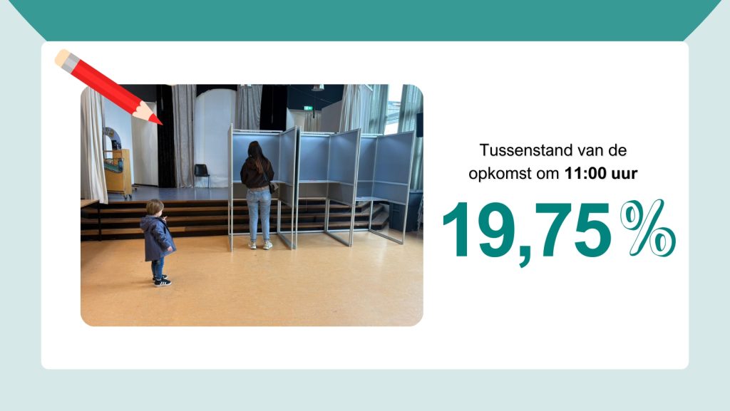 Het 1e opkomstpercentage is bekend. Om 11:00 uur heeft 19,75% van alle stemgerechtigden in Hof van Twente zijn of haar stem uitgebracht. Op de foto ziet u stembureau 22 – IKC Erve Hooyerinck.