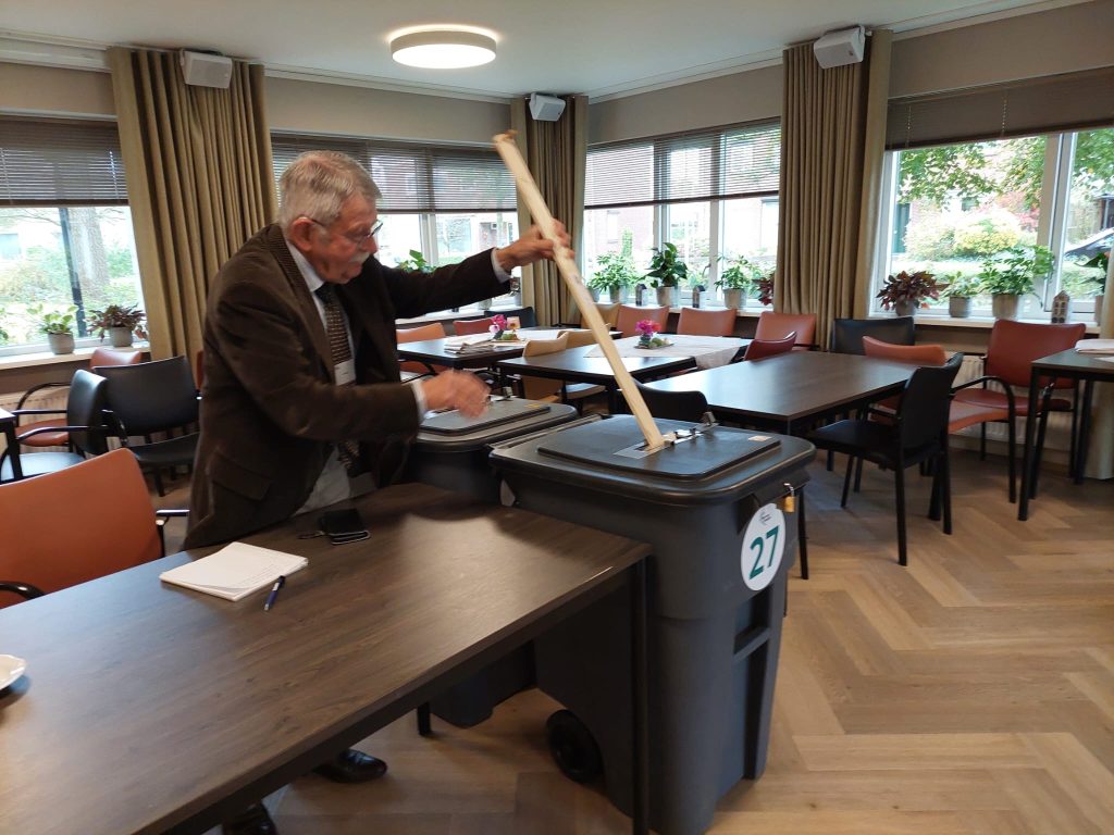 Ook bij stembureau 27 – WoZoCo Diepenheim gaat alles naar wens. De stembiljetten in de containers moeten zo nu en dan worden aangestampt!