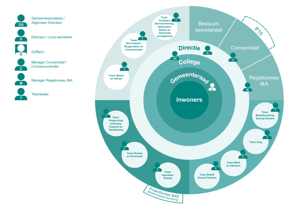 De vijfde en buitenste laag zijn de verschillende teams in het gemeentehuis. Deze zijn gegroepeerd. Aan het hoofd van elk team staat een teamleider.
